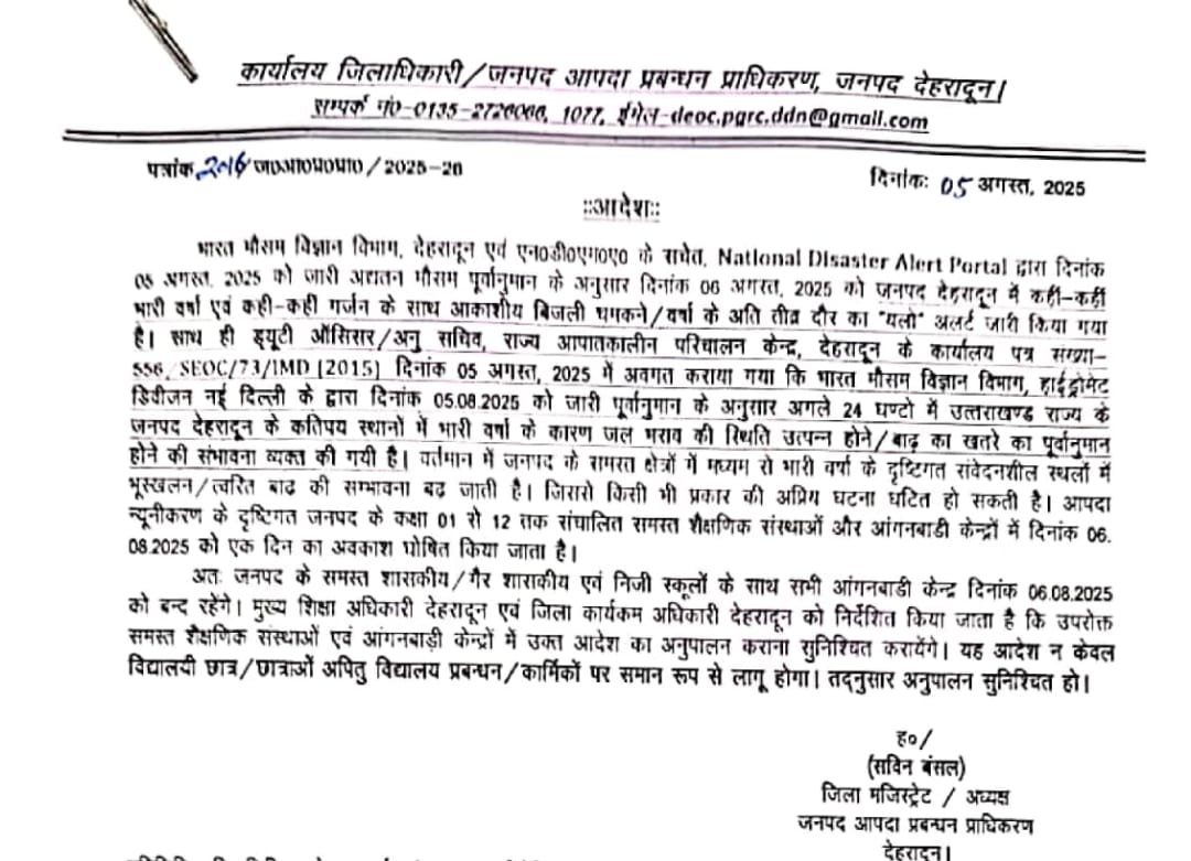 उत्तराखण्ड में बारिश का कहर जारी है। जिसे देखते हुए जहां शासन प्रशासन अलर्ट मोड पर आ गया है वहीं उत्तरकाशी के हरसिल धराली में हुई जल प्रलय से समूचे देश प्रदेश में हड़कंप मचा हुआ है। इसी बीच इस वक्त की सबसे बड़ी खबर स्कूलों एवं आंगनबाड़ी केंद्रों के संबंध में सामने आ रही है। बताया गया है कि उत्तरकाशी जिले में हुई बादल फटने अतिवृष्टि की घटना को देखते हुए उत्तरकाशी के अपर जिला मजिस्ट्रेट ने बुधवार 6 अगस्त को जिले के सभी विद्यालयों एवं आंगनबाड़ी केंद्रों में एक दिवसीय अवकाश घोषित कर दिया है।